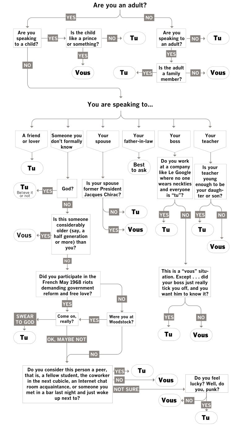 Heureusement, j'ai trouvé ce tableau très simple (merci à William Alexander), que je vais coller sur le mur de mon bureau et consulter avant de m'adresser à n'importe qui.